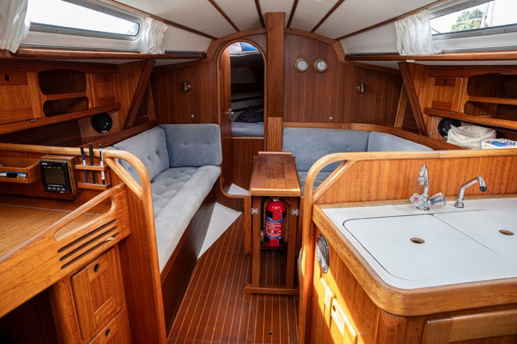 Denna båten seglas lätt på egen hand med den självslående focken och det utväxlade storskotet, allt nära till hands för rorsman. Med en relativt nyinstallerad Volvo Penta D1-30 tar den sig fram i bra fart när vindarna inte finns om man önskar detta. Layouten under däck är traditionell med förpik och garderober, salong som är bäddbar med 2 kojer. Akteröver är pentry och navigationsbord placerat och bakom detta dubbelkoj och toa. Inredningen är tillverkad i mattlackad mahogny.