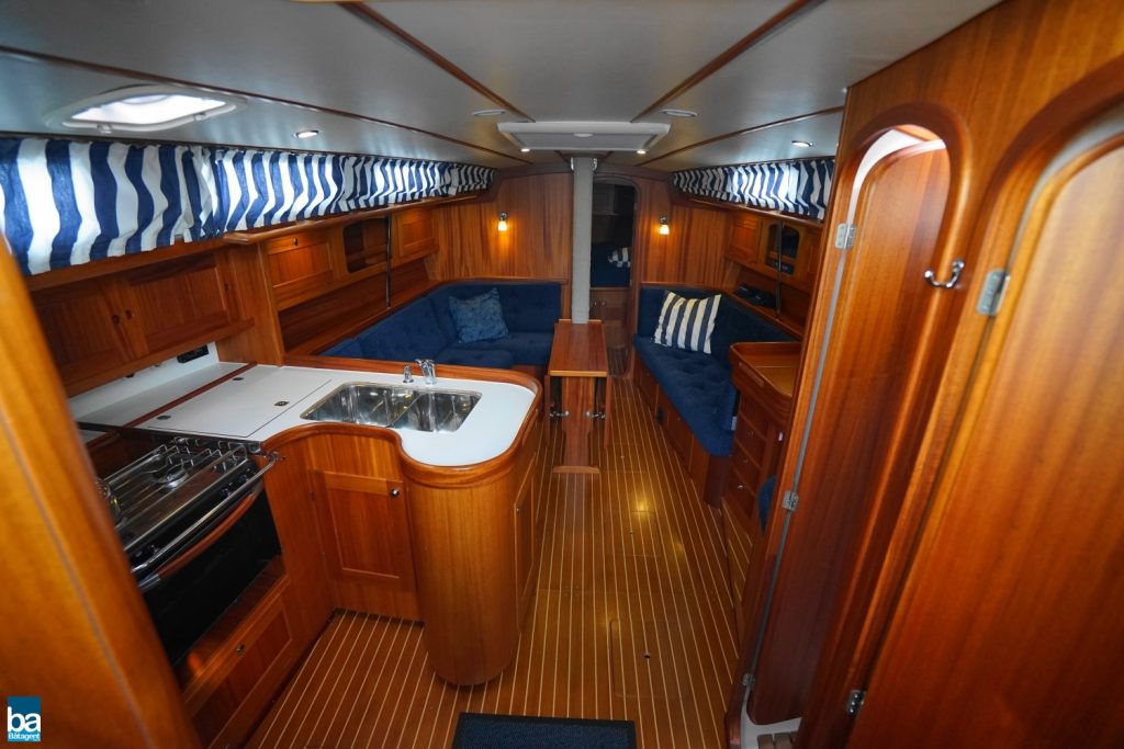 Arcona 400 har moderna snygga linjer, är starkt byggd med fin träinredning i mahogny. Verkligen att båt att trivas med. Båten har tre hytter med ägarhytten föröver. Här finns ett stort pentry med bra arbetsyta och en fin toalett med garderob för sjökläder och duschmöjligheter.