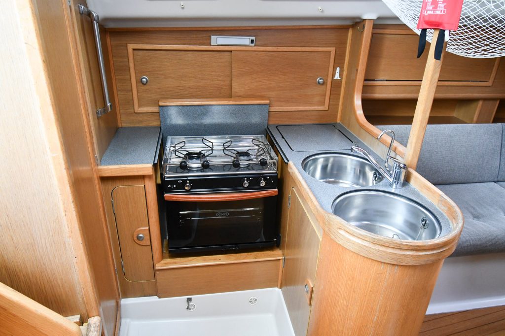 Invändigt erbjuder Dehler 35 CWS en praktisk och funktionell layout. Köket är välutrustat med spis, kylskåp och gott om förvaringsutrymme för matlagning under längre resor. Toaletten är rymlig och har ett handfat samt toalett, vilket gör den lättanvänd och bekväm för besättningen. Det finns även en salong med sittplatser för flera personer, vilket skapar en social och trivsam atmosfär ombord.