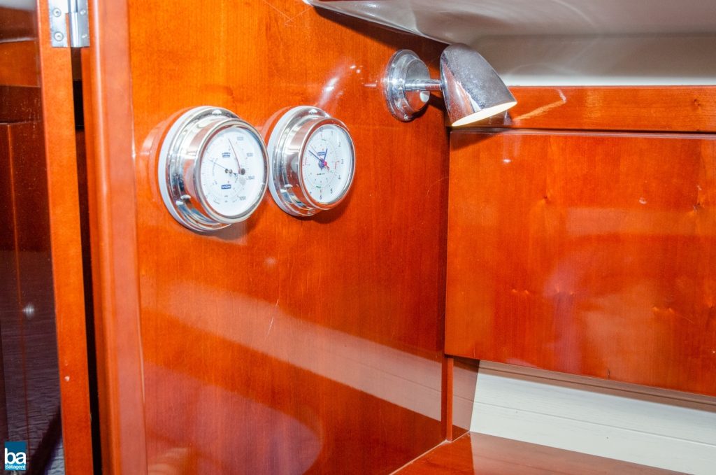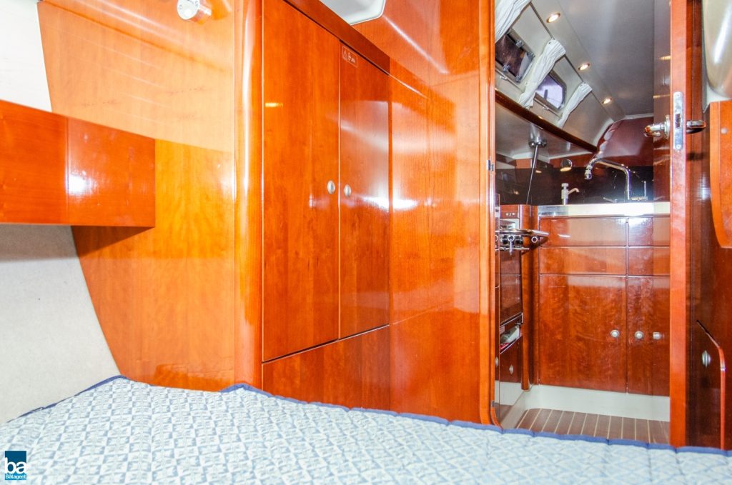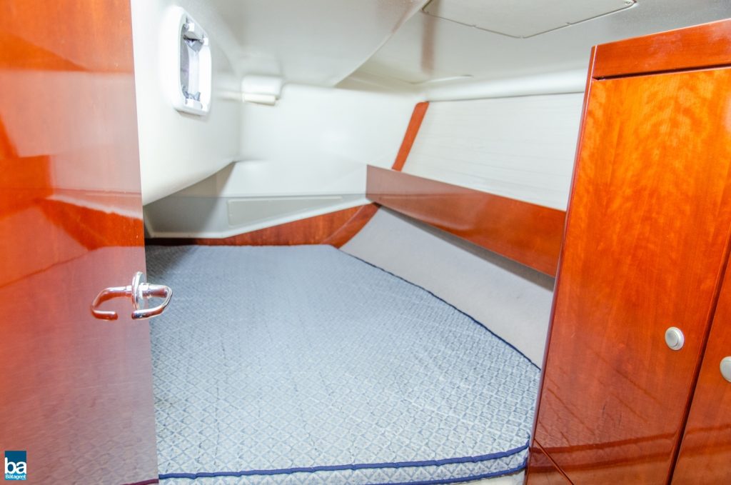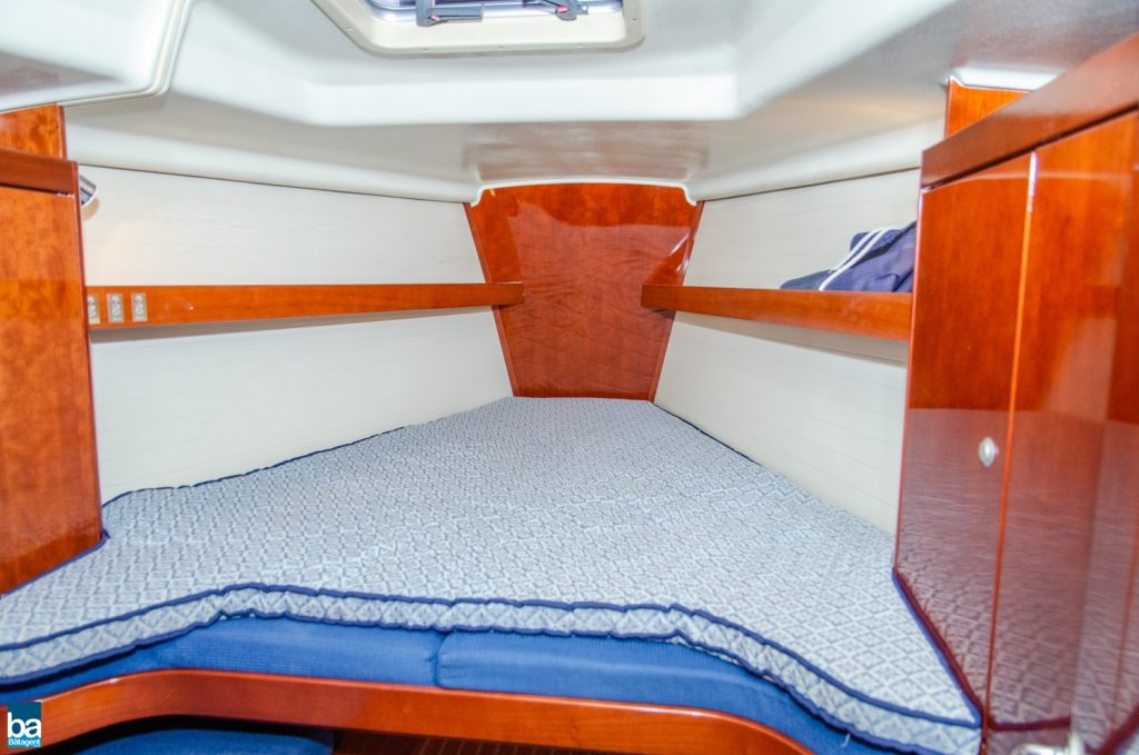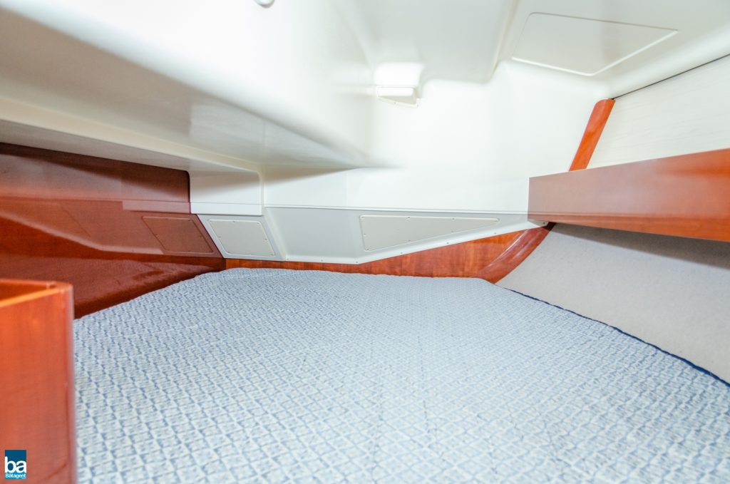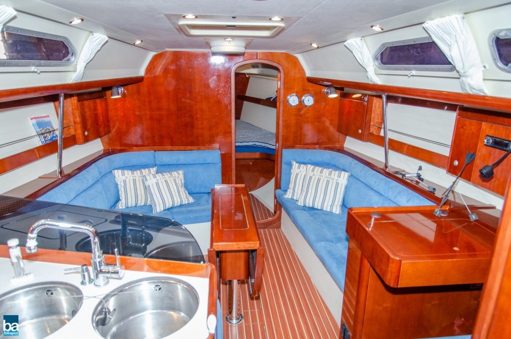 Under däck slås man av den välskötta inredningen. Om babord ett stort pentry med mycket förvaring, kyl, dubbla hoar och en spis med ugn. Om styrbord toalett med duschkabin. Genom duschen nås en extra koj om besättningen är månghövdad.. I annat fall ett fantastiskt fint stuvutrymme. Centralt i båten en väl tilltagen salong, ljust blå klädsel tillsamman med en lackad inredning ger en lyxig känsla. Hela besättningen får plats runt bordet för en middag eller samkväm. Akter om pentryt kommer man till en den stora och fina aktre hytten. Den är lite bredare än normalt. Slutgiltligen, längst förut en mysig och stor främre hytt. Hela båten har gott om bra förvaring för längre perioder till sjöss.