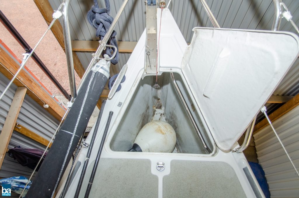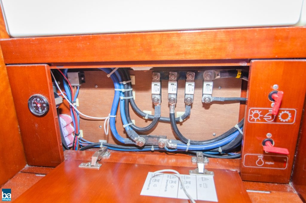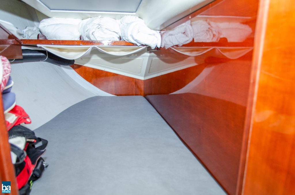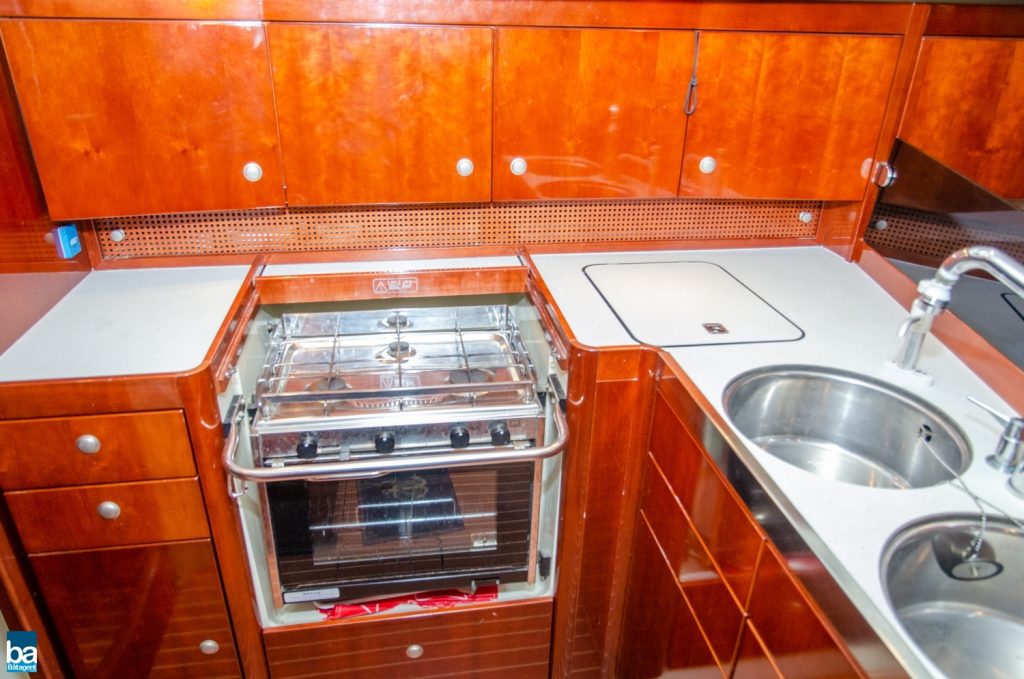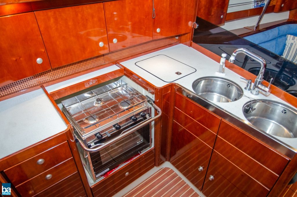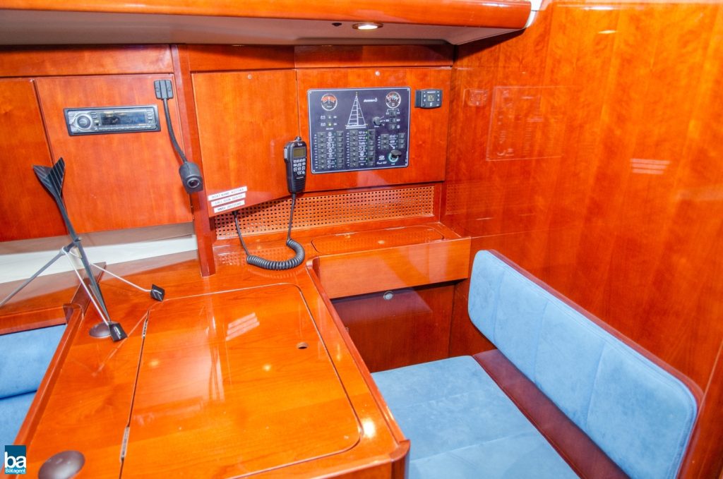 Under däck slås man av den välskötta inredningen. Om babord ett stort pentry med mycket förvaring, kyl, dubbla hoar och en spis med ugn. Om styrbord toalett med duschkabin. Genom duschen nås en extra koj om besättningen är månghövdad.. I annat fall ett fantastiskt fint stuvutrymme. Centralt i båten en väl tilltagen salong, ljust blå klädsel tillsamman med en lackad inredning ger en lyxig känsla. Hela besättningen får plats runt bordet för en middag eller samkväm. Akter om pentryt kommer man till en den stora och fina aktre hytten. Den är lite bredare än normalt. Slutgiltligen, längst förut en mysig och stor främre hytt. Hela båten har gott om bra förvaring för längre perioder till sjöss.