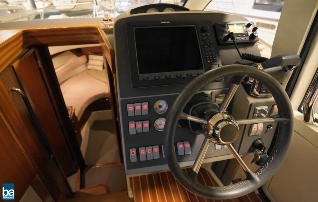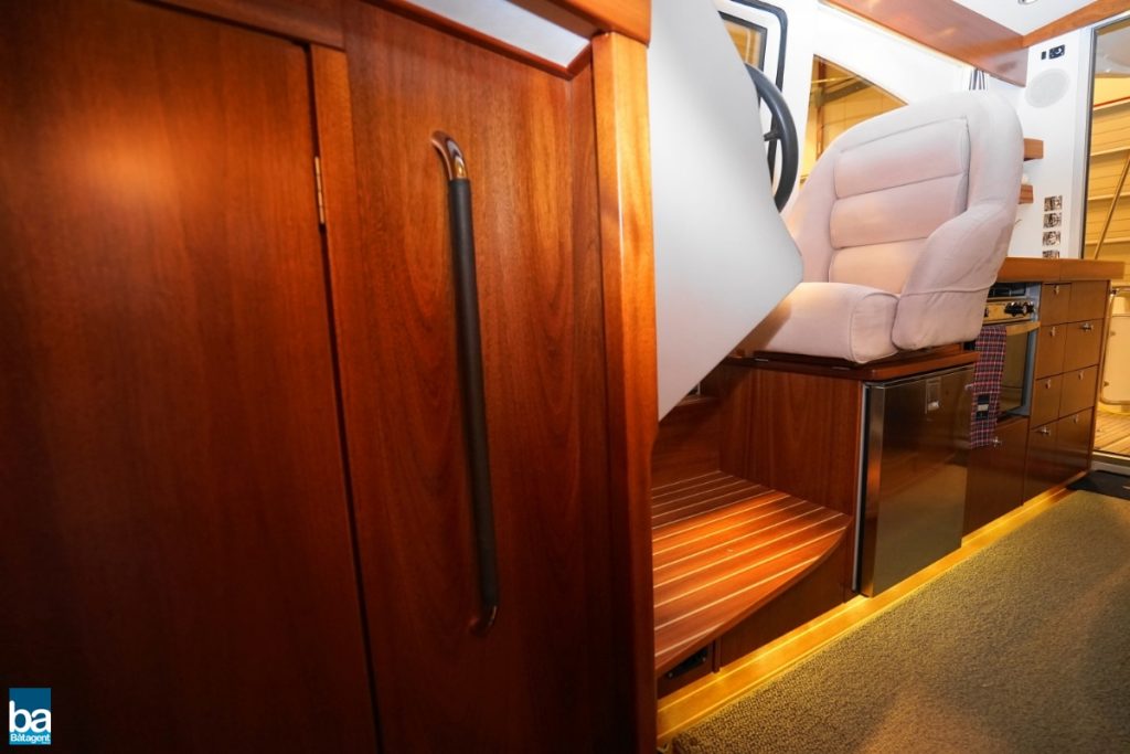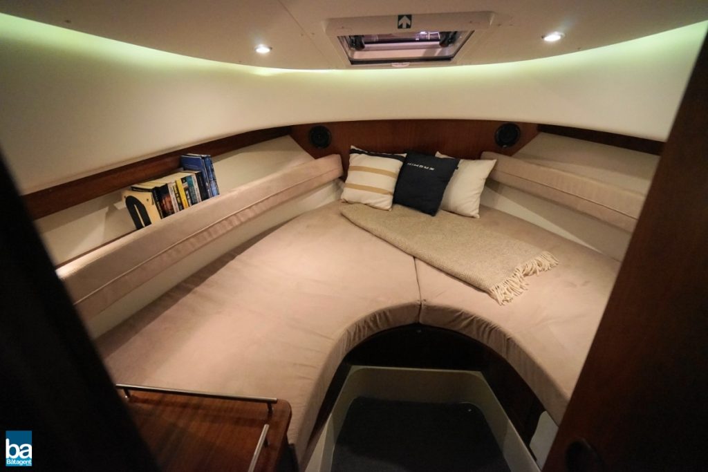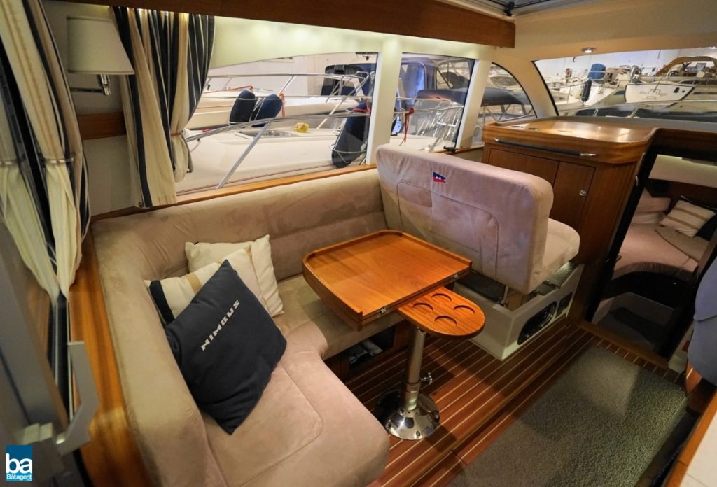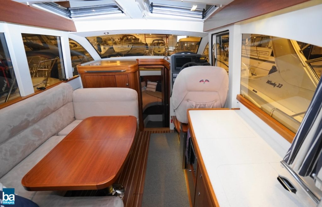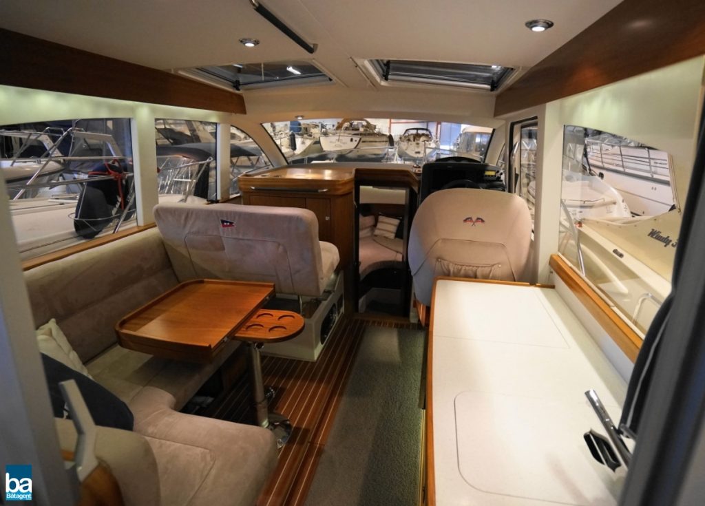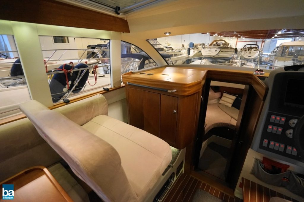 Här finns goda innerutrymmen med all bekvämlighet man kan önska sig. Med hjälp av kapell och stora takluckor i glas kan båten både vara öppen mot den vackra svenska sommaren likaväl som stängd och skyddad mot dåligt väder.