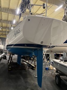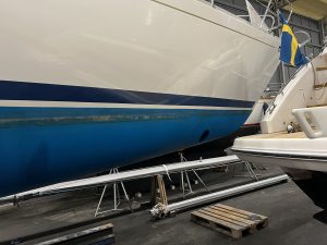Skrovet slipades rent från bottenfärg ner till epoxigrund.
